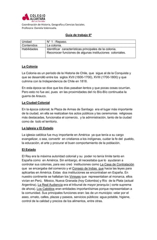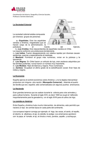 La colonia en Chile se desarrolló entre los siglos XVII y XVIII, hasta la independencia en 1818. La iglesia católica y el rey de España ejercían un fuerte control sobre la sociedad colonial, dividida en grupos como españoles, criollos, indígenas y esclavos. España también controlaba la economía chilena a través de su monopolio comercial.