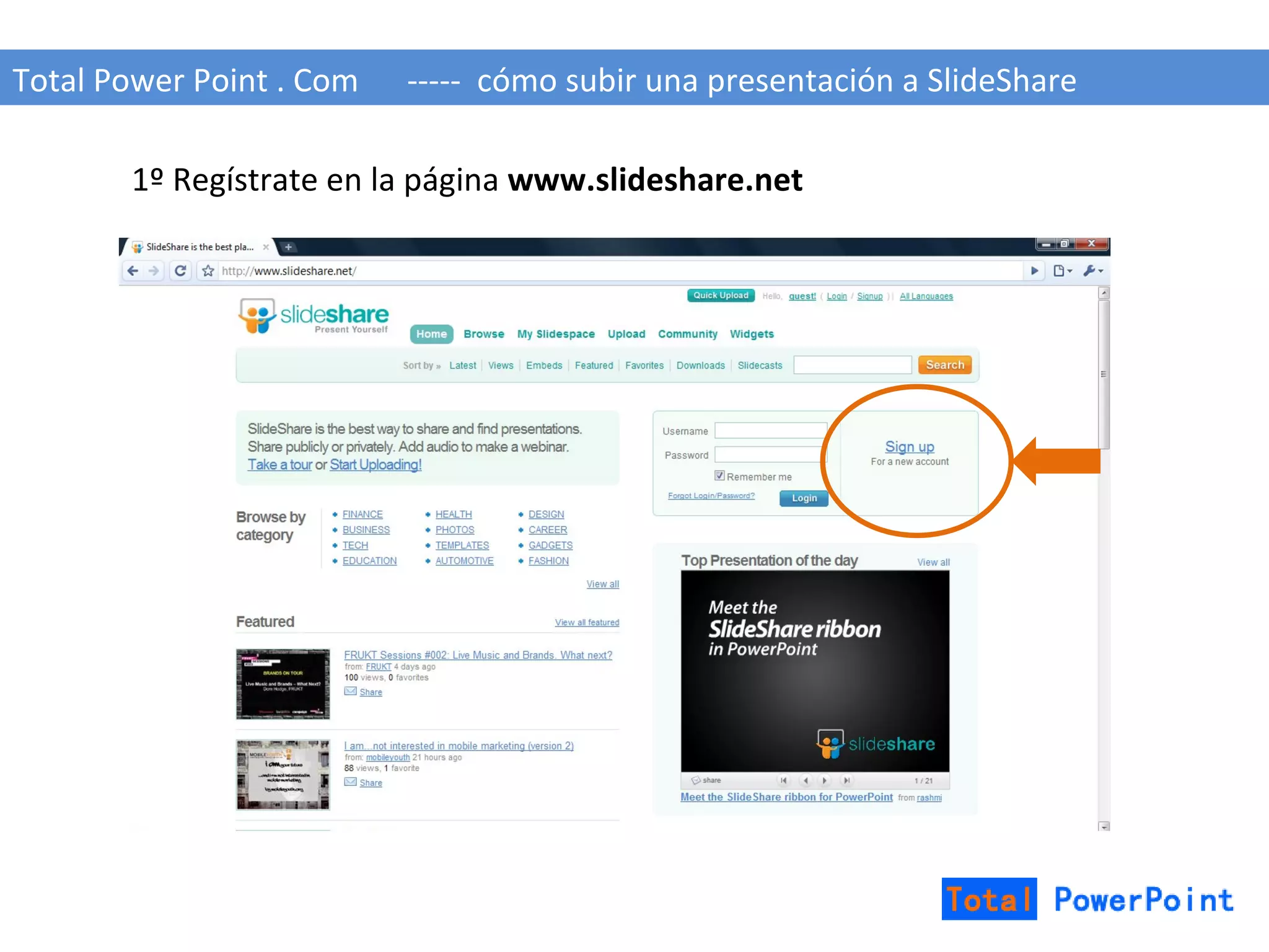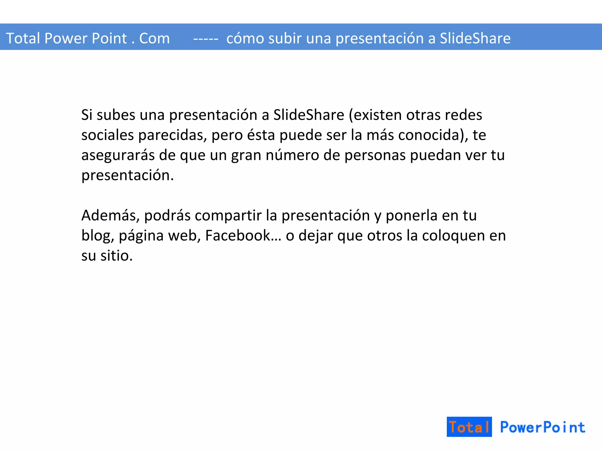 El documento proporciona instrucciones en 6 pasos para subir una presentación a SlideShare, incluyendo registrarse en SlideShare, seleccionar el archivo de presentación a subir, describir la presentación subida, y compartir la presentación en redes sociales y sitios web.