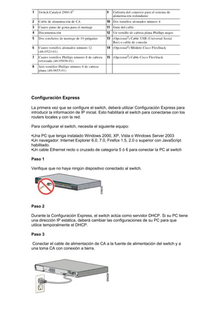 El documento describe los pasos para configurar un switch Catalyst 2960-S utilizando la Configuración Express. Esto incluye conectar el switch a una PC mediante un cable Ethernet, acceder a la interfaz web de configuración inicial ingresando una dirección IP predeterminada, e introducir la información básica de red como la dirección IP del switch. Una vez configurado, el switch estará listo para instalarse en la red.