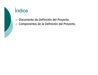Este documento describe los componentes clave de un plan de proyecto para la implementación de un sistema ERP. Incluye secciones sobre la definición del proyecto, los objetivos, el alcance, hitos, presupuesto, supuestos, riesgos, organización del equipo de proyecto y el enfoque general para completar el proyecto dentro del tiempo y el presupuesto asignados.