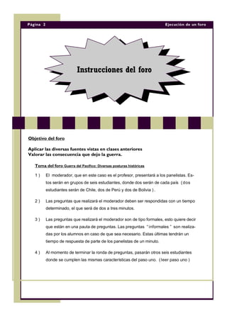 El documento presenta las instrucciones para un foro sobre la Guerra del Pacífico. El objetivo del foro es aplicar los conocimientos adquiridos en clase sobre los antecedentes, causas y consecuencias de la guerra, a través de un debate donde los estudiantes defenderán las posturas de Chile, Perú o Bolivia. El foro constará de rondas donde grupos de 6 estudiantes responderán preguntas del moderador representando a uno de los países involucrados.