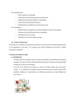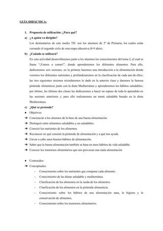 Este documento presenta una guía didáctica para enseñar sobre alimentación saludable a estudiantes de tercer grado. La guía propone utilizar tarjetas con fotos de alimentos y un mural para que los estudiantes completen una pirámide alimenticia. También incluye un video introductorio y actividades grupales como diseñar un menú saludable. El objetivo es que los estudiantes aprendan sobre nutrientes, una dieta balanceada y hábitos alimenticios saludables.