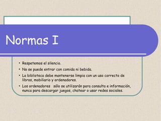 Este documento presenta las normas y procedimientos de la biblioteca del IES Miraflores de los Ángeles. Explica cómo deben comportarse los usuarios para mantener el silencio y orden en la biblioteca, así como los pasos para solicitar préstamos de libros, consultar el catálogo, y utilizar los ordenadores y espacios disponibles. También proporciona información sobre el horario de la biblioteca y el blog donde los estudiantes pueden comentar sus lecturas y recomendar libros.
