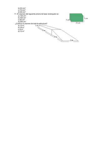 Este documento presenta 11 preguntas sobre el cálculo del volumen de prismas y pirámides. Las preguntas involucran conversiones de unidades, calcular el volumen de objetos geométricos dados sus dimensiones, y determinar el volumen total de estructuras compuestas.