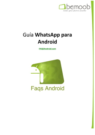 Este documento proporciona una guía para el uso de la aplicación WhatsApp en Android. Explica cómo descargar e instalar la aplicación, agregar un número de teléfono, iniciar chats con contactos y enviar mensajes, fotos, videos y ubicaciones. También cubre temas como añadir emojis, acceder a conversaciones guardadas y opciones de configuración y personalización.