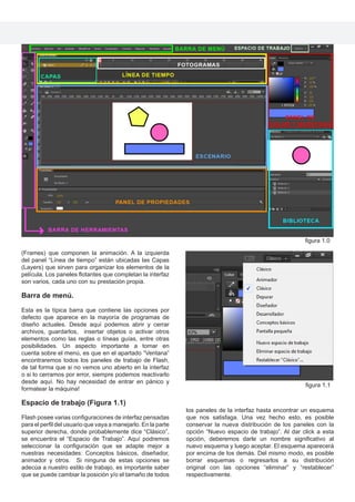 Este documento presenta una guía sobre Flash y su entorno de trabajo. Explica que Flash es un programa de animación que permite crear contenido interactivo para la web de manera vectorial e incluye sonido y video. Describe la interfaz de Flash, incluyendo la barra de herramientas, la línea de tiempo con capas y fotogramas, y diferentes tipos de animación. El objetivo es familiarizar a los estudiantes con las herramientas básicas de Flash.