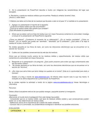 Este documento presenta una guía para estudiantes de 8o grado sobre un proyecto de investigación sobre residuos sólidos en su comunidad. El proyecto implica que los estudiantes trabajen en grupos para identificar qué residuo sólido contamina más su comunidad, investigar sus efectos y proponer soluciones. La guía describe las tareas del proyecto que incluyen definir residuos, clasificarlos, recolectar datos sobre los residuos encontrados, investigar el residuo más común y sus impactos, y presentar sus hallazgos y propuestas en una