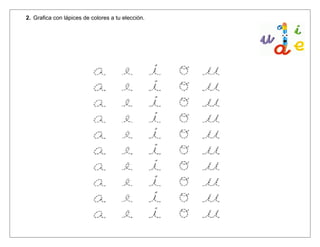 Este documento es una guía de retroalimentación para estudiantes de primer año básico que incluye nueve actividades para practicar las vocales. Las actividades incluyen escribir vocales en dibujos, graficar con colores, pintar vocales iniciales, encerrar elementos que comienzan con vocales específicas, completar palabras con vocales faltantes, colorear y adivinar objetos escondidos, aprender una canción, recortar y pegar vocales, y practicar lectura en voz alta. La guía también presenta cinco listas