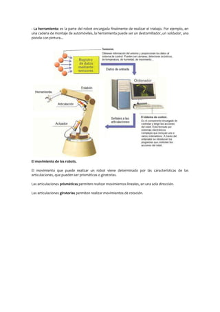 El documento habla sobre las aplicaciones de los robots controlados automáticamente en la industria moderna. Se usan robots en procesos peligrosos o que requieren alta precisión como en centrales nucleares, ingeniería de precisión y exploración espacial. Los robots tienen sistemas mecánicos, eléctricos u otros que permiten su movimiento y herramientas para realizar tareas. Existen diferentes configuraciones de robots como cartesiano, cilíndrico y antropomórfico.