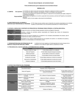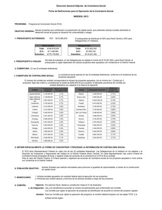 El documento proporciona información sobre el Programa de Coinversión Social (PCS) operado por el INDESOL en 2013, incluyendo: (1) El presupuesto autorizado para el programa fue de $310,580,879, distribuido entre el nivel central y las delegaciones estatales. (2) La contraloría social operará en las 32 entidades federativas para vigilar los proyectos apoyados por el programa. (3) Se establecen lineamientos para la constitución y registro de Comités de Contraloría Social a nivel estatal y municipal para vigilar
