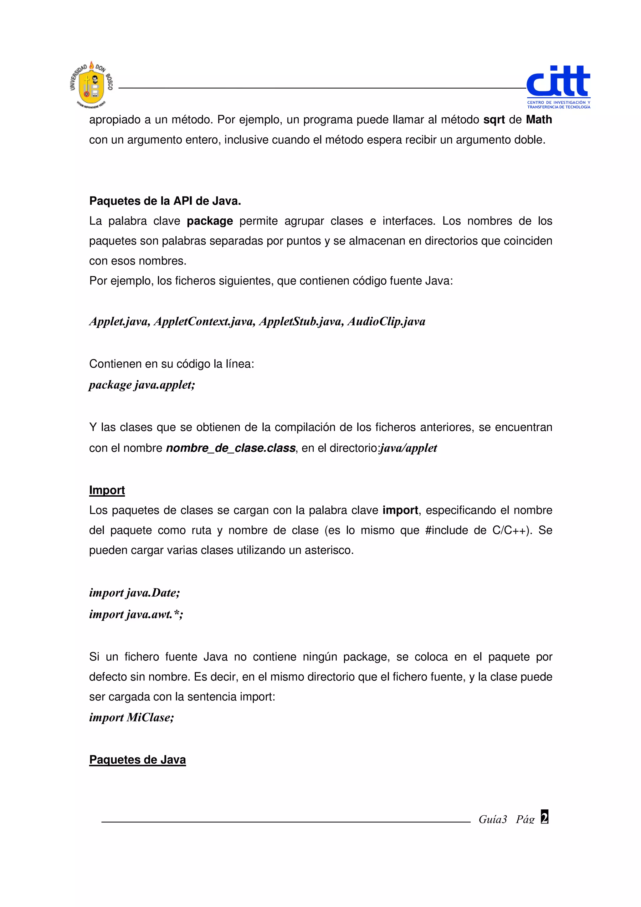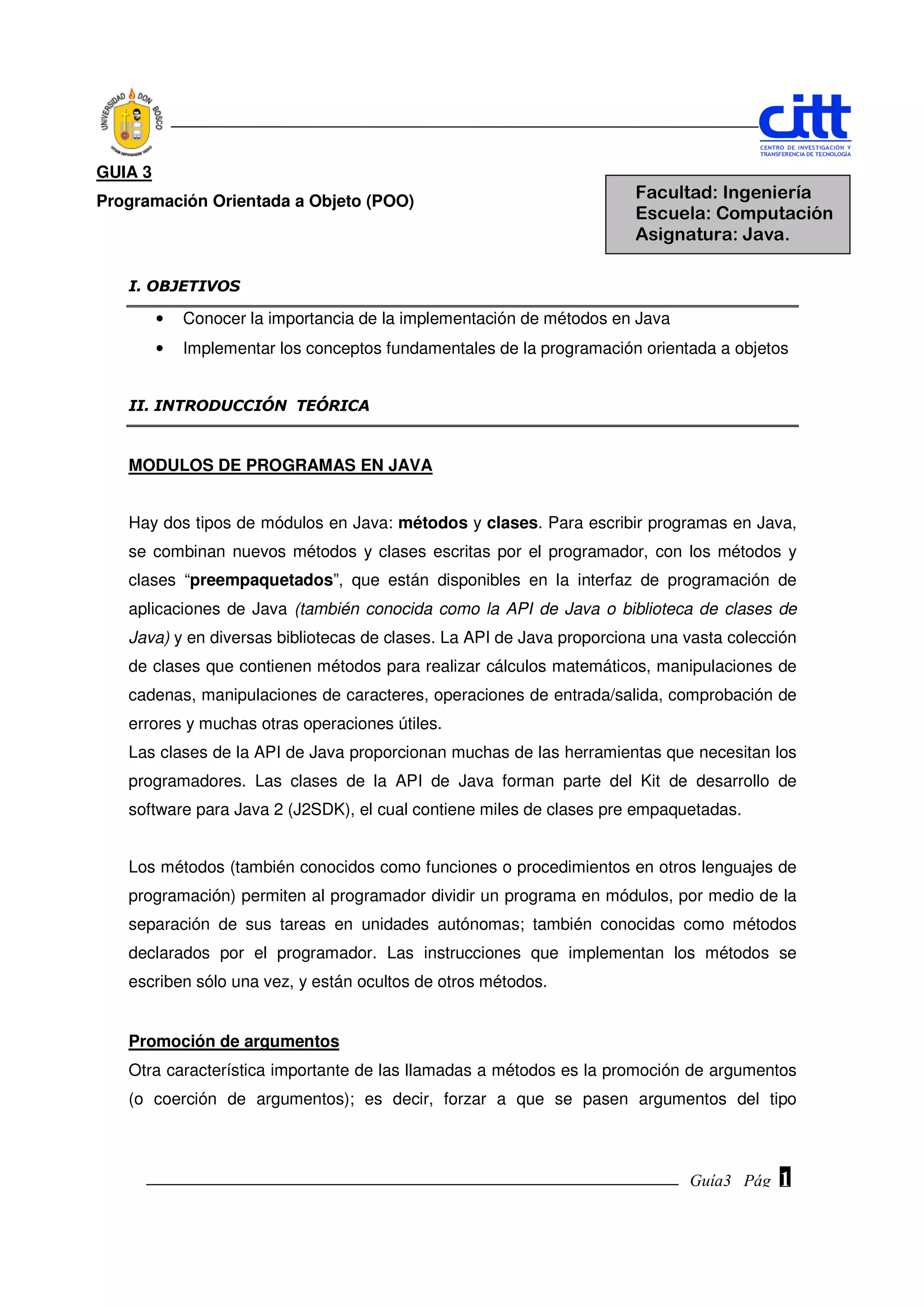 El documento presenta una guía sobre programación orientada a objetos en Java. Explica los conceptos básicos como clases, objetos, métodos, encapsulamiento, herencia y paquetes. También incluye un ejemplo de implementación de una clase Tiempo1 que modela un reloj y métodos para establecer la hora, convertirla a string en formatos universal y estándar.