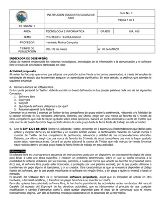 Este documento presenta una guía para un proyecto tecnológico en el que los estudiantes deben realizar tareas en Twitter relacionadas con conceptos de software libre y la Ley 1273 de 2009. Los estudiantes deben definir conceptos clave de software libre en tweets y comentar tweets de compañeros. También deben presentar recomendaciones para aplicar la ley mencionada en tweets y comentar tweets de otros. El documento incluye definiciones detalladas de varios tipos de software.