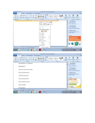 El documento describe tres grupos de personas con diferentes condiciones médicas y las instrucciones para copiar y pegar información sobre ellos utilizando los atajos de teclado Ctrl + C y Ctrl + V y las opciones de menú contextual Copiar y Pegar.