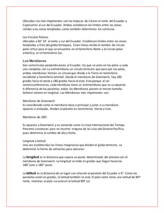 Las líneas imaginarias más importantes de la Tierra incluyen el ecuador, los trópicos de Cáncer y Capricornio, y los círculos polares. El ecuador divide la Tierra en dos hemisferios iguales, mientras que los trópicos y círculos polares establecen los límites entre las zonas cálidas, templadas y frías. Los meridianos y paralelos ayudan a determinar la longitud y latitud para ubicarse en cualquier punto del planeta.