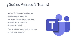 Microsoft Teams es la aplicación de videoconferencias de Microsoft, accesible desde navegadores y dispositivos móviles. Para unirse a una clase, se debe usar el enlace enviado por correo y esperar la aprobación del instructor. Se recomienda silenciar el micrófono una vez conectado y seguir las instrucciones del instructor durante la sesión.
