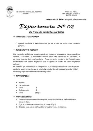 Los documentos presentan 9 experimentos sobre conceptos magnéticos y eléctricos para estudiantes de quinto grado. Los experimentos incluyen observar luz producida al desenrollar cinta aislante, demostrar corrientes parásitas usando un imán y cobre, y crear un electroimán simple usando una pila y cable.