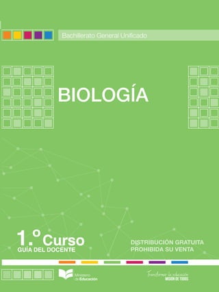 El documento presenta información sobre una guía del docente para el curso de Biología del primer año de Bachillerato General Unificado. Brevemente describe que el Ministerio de Educación ha realizado ajustes curriculares para mejorar las oportunidades de aprendizaje de los estudiantes en el marco de un proyecto educativo basado en los principios del Buen Vivir. Además, los docentes recibirán guías didácticas para enriquecer los procesos de enseñanza y aprendizaje más allá del aula usando los textos de