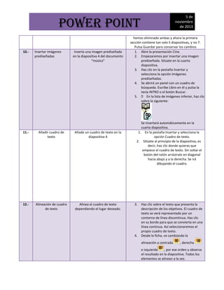 Este documento proporciona instrucciones para 20 tareas diferentes relacionadas con PowerPoint. Las tareas incluyen agregar cuadros de texto, imágenes y gráficos; aplicar temas, estilos y animaciones; guardar y exportar presentaciones; e insertar sonido. El documento explica los pasos necesarios para completar cada tarea de manera concisa.