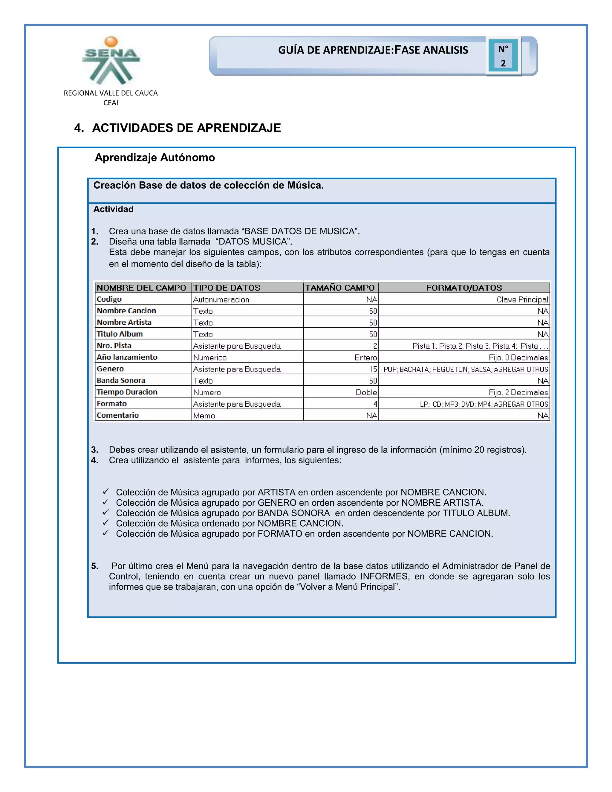Esta guía de aprendizaje se enfoca en enseñar el uso de Microsoft Access 2007 para crear una base de datos de música. Los estudiantes aprenderán a diseñar tablas, crear formularios e informes, y organizar la base de datos con menús de navegación. La evaluación se basará en la capacidad de los estudiantes para utilizar herramientas de bases de datos y ofimáticas para resolver problemas.