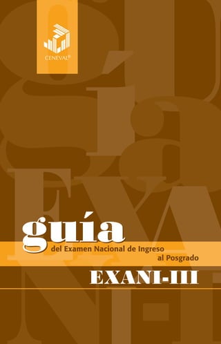 Este documento presenta una guía sobre el Examen Nacional de Ingreso al Posgrado (EXANI-III). Explica que el EXANI-III evalúa habilidades generales necesarias para estudios de posgrado a través de dos tipos de exámenes. Describe la estructura, contenidos y modalidades de preguntas de cada examen, e incluye instrucciones para sustentantes y detalles sobre resultados. El objetivo es orientar a los sustentantes sobre este examen de admisión a posgrados.