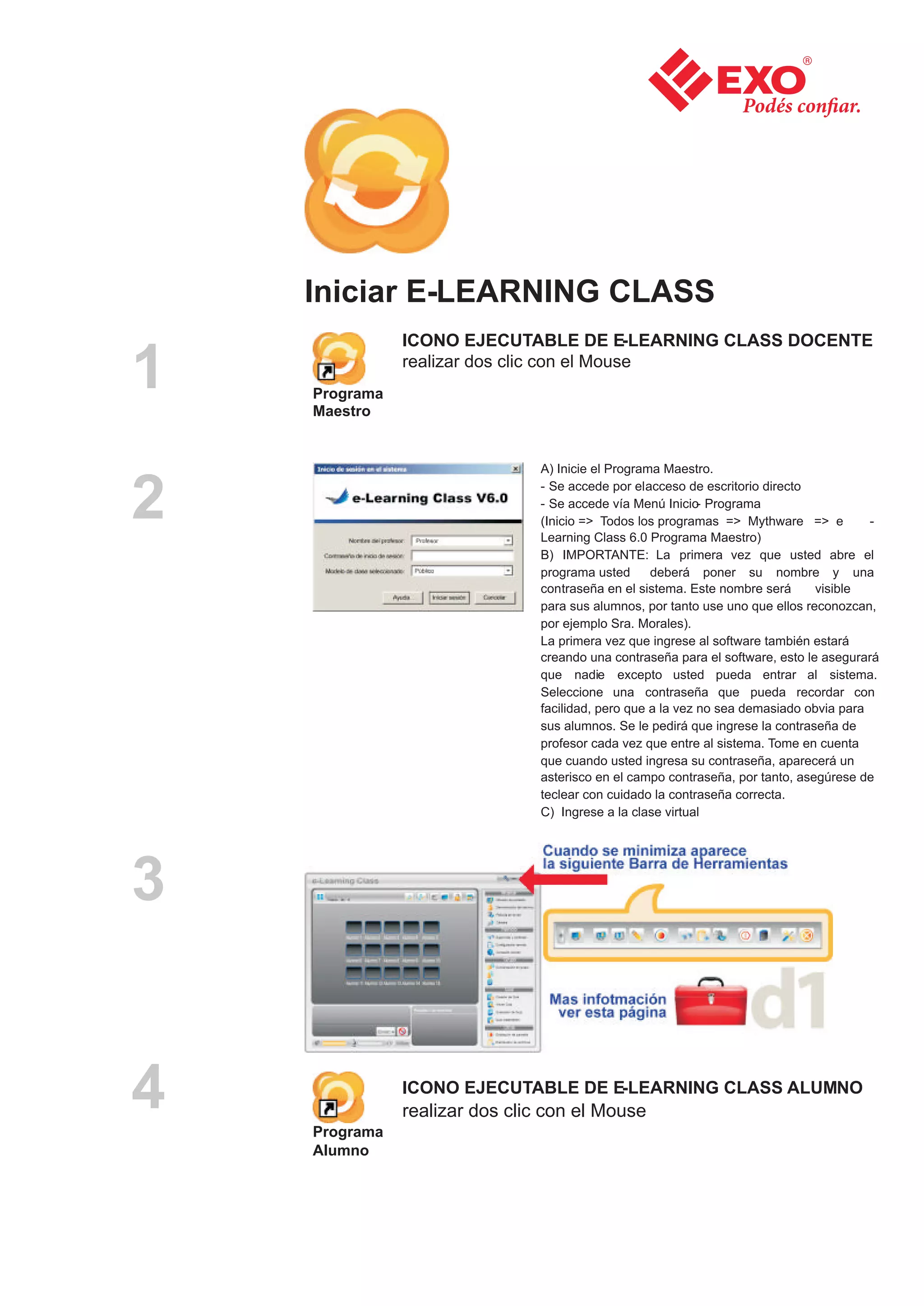 Este documento proporciona una guía del usuario para el programa E-Learning Class. Explica cómo los profesores pueden iniciar sesión en el programa maestro y crear clases virtuales, y cómo los estudiantes pueden unirse a las clases de sus profesores utilizando el programa de estudiantes. También describe las herramientas que los profesores y estudiantes tienen a su disposición durante las clases, como la difusión de pantallas y sonido, y cómo los profesores pueden crear y administrar evaluaciones para los estudiantes.