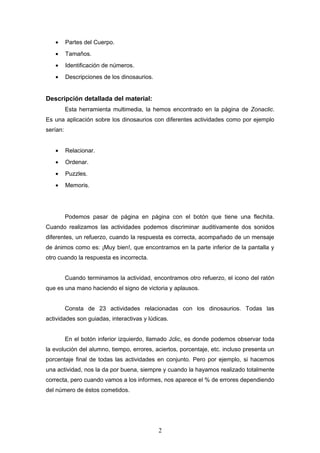 Este documento proporciona una guía para un juego multimedia sobre dinosaurios destinado a estudiantes de primaria. El juego incluye varias actividades interactivas sobre dinosaurios y sus características. El documento describe los objetivos educativos, contenidos, características y uso potencial del juego en el aula para motivar a los estudiantes y enseñar sobre dinosaurios de una manera lúdica.