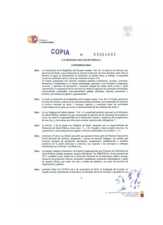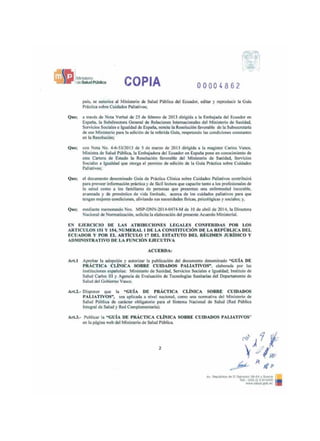 Este documento presenta la Guía de Práctica Clínica sobre Cuidados Paliativos adoptada por el Ministerio de Salud Pública de Ecuador. La guía ofrece recomendaciones basadas en evidencia para apoyar a médicos y pacientes en la toma de decisiones sobre cuidados paliativos. Fue desarrollada por profesionales de salud ecuatorianos y españoles, y adoptada por el MSP de Ecuador para su uso en el Sistema Nacional de Salud.