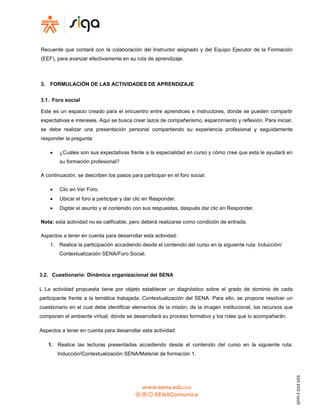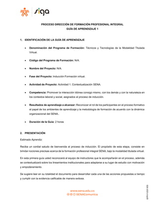 Este documento presenta una guía de aprendizaje para la inducción de aprendices en el SENA. La guía incluye tres actividades: 1) participar en un foro social para presentarse y compartir expectativas, 2) responder un cuestionario sobre la dinámica organizacional del SENA, y 3) consultar materiales de apoyo. El objetivo es que los aprendices reconozcan el rol de los participantes y la metodología de formación del SENA.