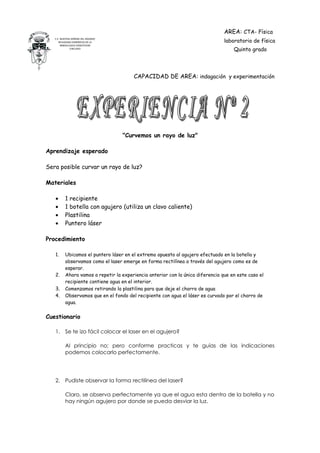 Este documento contiene la descripción de varios experimentos relacionados con conceptos básicos de física como la propagación de la luz, reflexión, refracción y velocidad de la luz. Se explican de manera detallada los materiales necesarios y los pasos a seguir para realizar experimentos como crear una "lupa" usando papel de aluminio, curvar un rayo láser con un chorro de agua, calcular la velocidad de la luz midiendo la distancia entre "dunas lácteas" en el microondas, y demostrar que la l