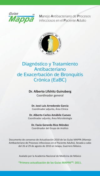 Este documento presenta las guías actualizadas para el diagnóstico y tratamiento antibacteriano de la exacerbación de bronquitis crónica. Resume la participación de varios expertos en neumología, infectología y microbiología en la actualización de las guías originales. El objetivo es proporcionar recomendaciones actualizadas sobre el manejo adecuado de esta afección respiratoria común.