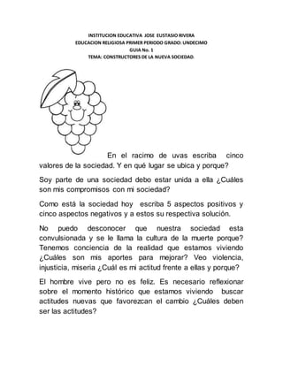 Este documento presenta tres guías para la clase de educación religiosa de grado 11 que abordan varios temas. La primera guía explora los valores de la sociedad y los compromisos de los individuos con su comunidad. La segunda guía examina la violencia en la sociedad y posibles soluciones. La tercera guía define la nueva cultura y características del hombre moderno.