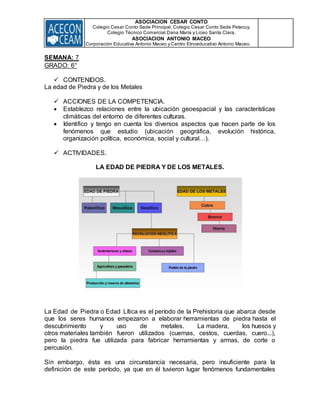 El documento resume las características de las edades de Piedra y los Metales. La Edad de Piedra incluyó el Paleolítico, Mesolítico y Neolítico, durante los cuales los humanos desarrollaron herramientas de piedra, caza y recolección. En el Neolítico se introdujeron la agricultura y la ganadería. La Edad de los Metales incluyó las edades de Cobre, Bronce e Hierro, cuando los humanos comenzaron a trabajar y comerciar metales. El documento proporciona