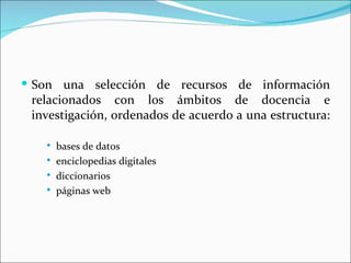 Este documento define los directorios de recursos como recursos digitales que organizan y proveen acceso a otra información como bases de datos, enciclopedias, diccionarios y páginas web. Provee enlaces sistemáticos a estos recursos y tiene como objetivo apoyar a una comunidad de usuarios. Describe características como especificidad temática, criterios de calidad, evaluación por expertos y uso de estándares. Explica que los directorios buscan aumentar visibilidad, gestionar conocimiento e incrementar alcance. Finalmente, menciona tip