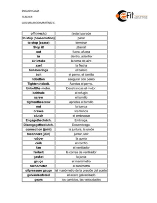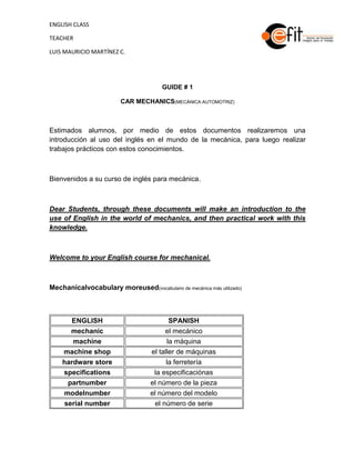Este documento presenta un vocabulario básico de inglés para mecánica automotriz. Incluye palabras comunes como "mechanic", "machine", "hardware store", y partes de autos como "axel", "ball-bearings", "bolt", "brake", "clutch", "fanbelt", "gasket", "gears", "grease", "lever", "oilfilter", "pump", "rivet", "valve", y "washer". El documento propone actividades como hacer un crucigrama con palabras de mecánica y escribir oraciones con el vocabulario incluy