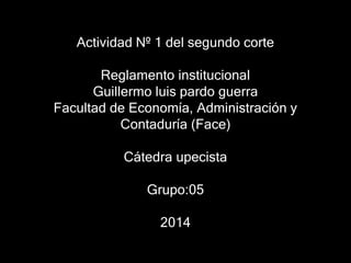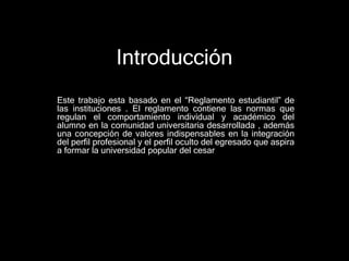 Este documento resume el reglamento estudiantil de una universidad. Explica que el reglamento establece las normas de comportamiento para los estudiantes y los valores que la universidad busca inculcar. También define el reglamento, sus ventajas, y cómo se aplica en situaciones como fraude académico, agresión física, solicitud de transferencia o revisión de calificaciones. Concluye que conocer el reglamento es útil para que los estudiantes sepan cómo actuar frente a diferentes problemas en la institución.