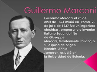 El documento discute el desarrollo de la radio y la controversia sobre su inventor. Aunque Nikola Tesla obtuvo catorce patentes relacionadas con la radio y su colega Julio Cervera registró la primera transmisión inalámbrica en 1897, Guillermo Marconi también reclamó haber inventado la radio y obtuvo subsidios del gobierno británico. Más tarde, la Corte Suprema de EE. UU. determinó que los derechos de patente correspondían a Tesla, no a Marconi.