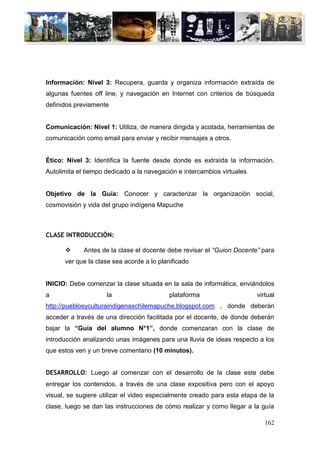 Este documento presenta una guía docente para una lección de 90 minutos sobre la sociedad mapuche antes de la llegada de los españoles. La lección comienza con los estudiantes analizando imágenes en línea y luego el maestro proporciona información a través de una presentación visual apoyada. Los estudiantes completan actividades en línea individuales y en grupo que incluyen un mapa conceptual, un museo virtual 3D interactivo, y el análisis de fuentes primarias. El maestro supervisa a los estudiantes y responde pre