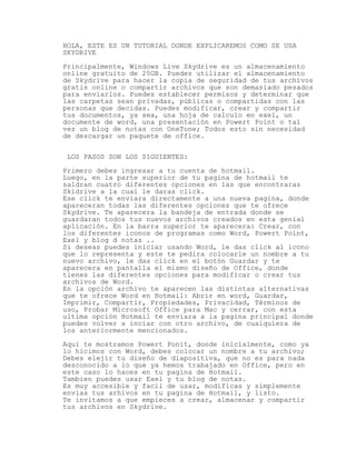 Skydrive es un almacenamiento en línea gratuito de 25GB que permite copias de seguridad de archivos, compartir archivos pesados y establecer permisos de acceso privados, públicos o compartidos. Los pasos para usar Skydrive incluyen ingresar a la cuenta de Hotmail, hacer clic en la opción Skydrive para acceder a las herramientas de creación de documentos como Word, PowerPoint y Excel sin necesidad de descargar software adicional. Los archivos creados se guardan en Skydrive para ser accedidos y compartidos fácilmente.