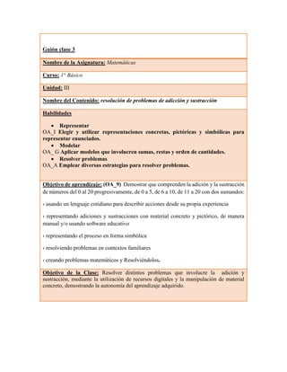 Este documento presenta un guión para una clase de matemáticas sobre la resolución de problemas de adición y sustracción para estudiantes de primer grado básico. La clase se divide en 4 fases: 1) Presentación de un problema matemático, 2) Trabajo en grupos para resolver el problema usando material concreto, 3) Validación del aprendizaje resolviendo ejercicios en línea, 4) Explicación del maestro sobre cómo resolver correctamente el problema inicial. El objetivo es que los estudiantes demuestren su comprensión de la adición y