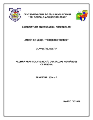 Este documento proporciona información sobre el Jardín de Niños "Federico Froebel" en tres oraciones: Contiene 11 salones, incluyendo 8 grupos, uno de música, dirección y oficina. El material didáctico en el aula incluye plastilina, crayolas, botones y más, y está dividido en áreas como juegos de construcción y lectura. La escuela atiende 167 estudiantes de 2o y 3o grado en 8 grupos y cuenta con servicios como electricidad e internet.