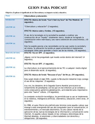 El guion del podcast 'Cibercultura y Educación' explora el significado de la cibercultura y su impacto en la sociedad y la educación, destacando la importancia del uso de las TIC para la comunicación y el aprendizaje. Se discute la evolución tecnológica desde la revolución industrial hasta la actualidad, enfatizando la necesidad de adaptar los currículos educativos para incorporar estas tecnologías. Además, se aborda el tema de la discriminación digital como un desafío que debe ser solucionado por la educación y la sociedad.