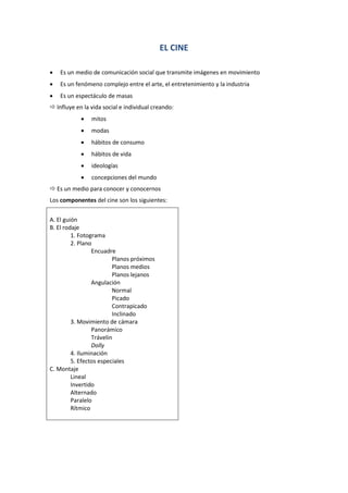 El cine es un medio de comunicación social y un espectáculo de masas que influye en la vida social e individual creando mitos, modas, hábitos de consumo y concepciones del mundo. Se compone de elementos como el guión, el rodaje utilizando diferentes planos, ángulos, movimientos de cámara e iluminación, y el montaje de escenas y secuencias para contar una historia de manera lineal o no lineal.