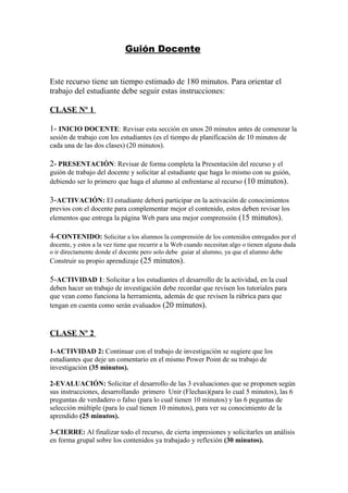 Este guión docente proporciona instrucciones para una sesión de clase de 180 minutos dividida en dos clases. La primera clase incluye la presentación del recurso, activación de conocimientos previos, comprensión de contenidos y una actividad de investigación. La segunda clase continúa la actividad de investigación, incluye tres evaluaciones para medir el aprendizaje y un cierre con reflexión grupal.