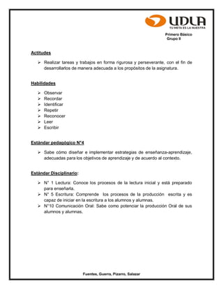 Este documento presenta un guión docente para una clase de primer grado básico sobre la letra Ll. La clase tiene como objetivo que los estudiantes identifiquen fonética y gráficamente la letra Ll a través de juegos, ejercicios de escritura y lectura. El docente utiliza enlaces educativos para realizar adivinanzas y una sopa de letras con palabras que contengan Ll. Los estudiantes también practican escribiendo y leyendo silabas como lla, lle, lli, llo y llu.