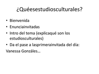Este documento presenta el guión de un programa informativo sobre estudios culturales. El programa incluye introducciones de cuatro invitados que hablarán sobre temas nacionales, políticos, tecnológicos y musicales. Al final, la conductora dará conclusiones sobre la importancia de los estudios culturales y invitará a los televidentes a la próxima edición.