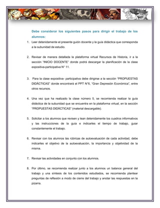 Este documento presenta una guía didáctica para enseñar sobre la Gran Depresión Económica de 1929 a estudiantes de primer año medio. La guía incluye una presentación de PowerPoint y actividades para una sesión de 90 minutos. El documento instruye a los profesores a descargar los recursos de la plataforma virtual, revisar la guía con los estudiantes, guiar el trabajo de los estudiantes y revisar las actividades y los aprendizajes al final de la sesión.