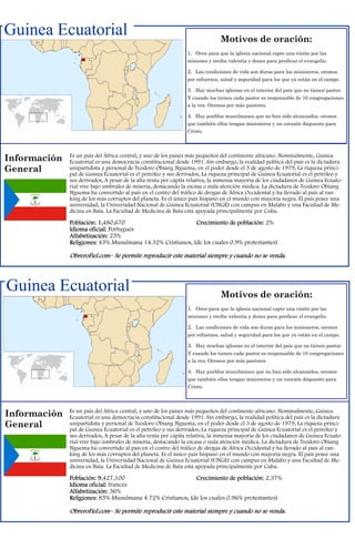 El documento pide oraciones para la iglesia y los misioneros en Guinea Ecuatorial. Solicita oraciones para que la iglesia nacional tenga una visión de las misiones, para el refuerzo y bienestar de los misioneros, y para que haya más pastores para las iglesias sin pastor o con un solo pastor a cargo de 10 congregaciones. También pide orar para que los pueblos musulmanes sean alcanzados con el evangelio.