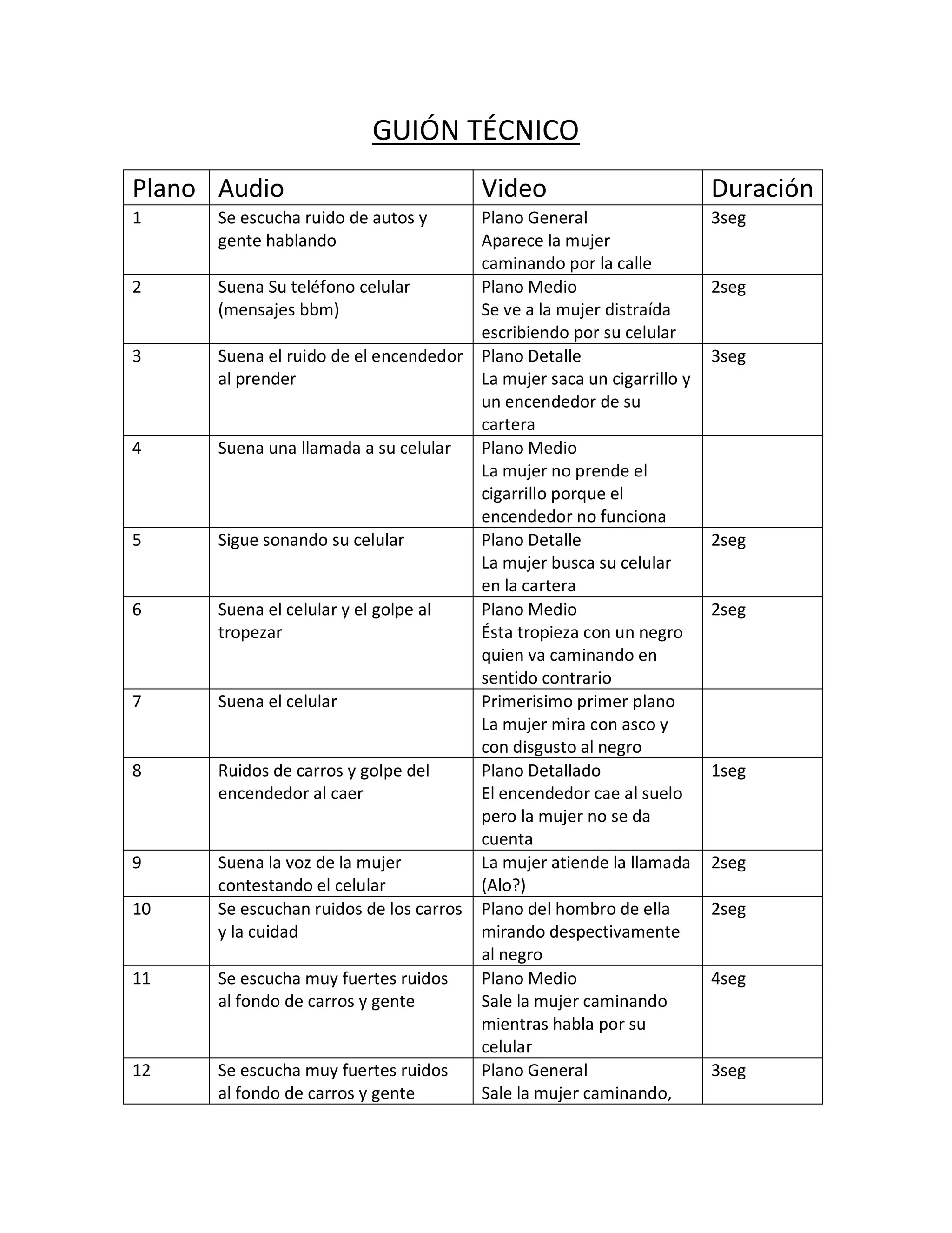 El guión técnico describe 22 planos de video y audio que narran la historia de una mujer que camina distraída por la calle mientras usa su celular. Ella tropieza con un hombre negro, lo mira con asco y continúa su camino. La mujer empieza a caminar más rápido porque cree que el hombre la sigue, pero finalmente se vuelven a encontrar y el hombre le devuelve su encendedor que se le había caído.