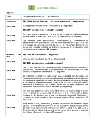 El documento describe la importancia del uso de las tecnologías de la información y la comunicación (TIC) en la educación. Explica que las TIC permiten almacenar, procesar y transmitir conocimiento de manera atractiva, y facilitan la construcción de nuevos conocimientos a través de la participación e interacción. También señala la necesidad de desarrollar habilidades para buscar y evaluar información de manera crítica en Internet. Finalmente, recuerda que la tecnología solo es una herramienta de apoyo y no debe re