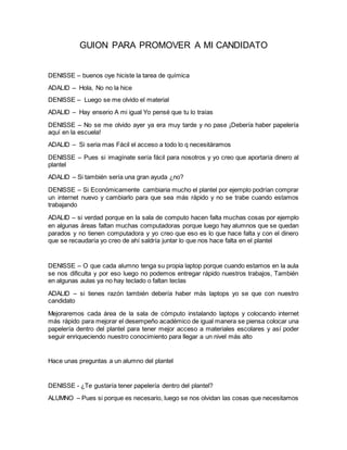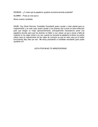 Denisse y Adalid discuten la falta de materiales escolares y computadoras funcionales en su escuela. Sugieren que instalar una papelería en la escuela ayudaría a los estudiantes a acceder fácilmente a los suministros que necesitan y también generaría ingresos para la escuela que podrían usarse para mejorar el internet y comprar más computadoras. Más tarde, Denisse le pregunta a otro estudiante si le gustaría tener una papelería en la escuela y si cree que ayudaría financieramente, a lo que el estudiante responde que sí